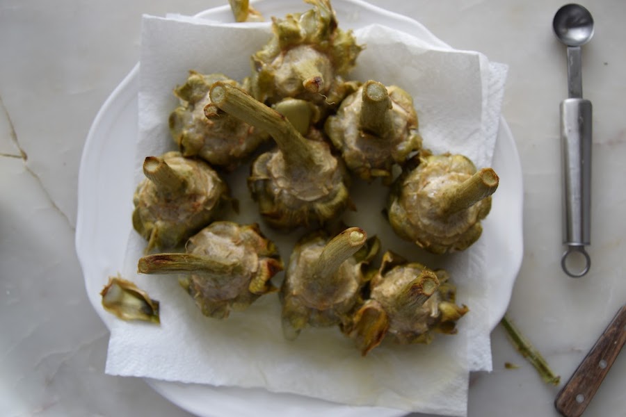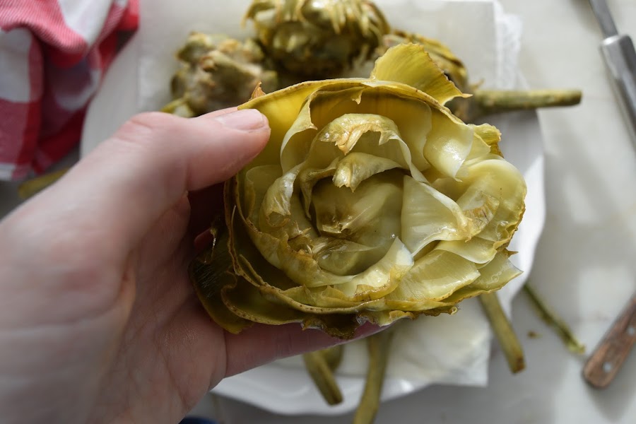 3. Una vez frías abre las alcachofas un poco con los dedos y despega las hojas "como si fueran un crisantemo abierto".
