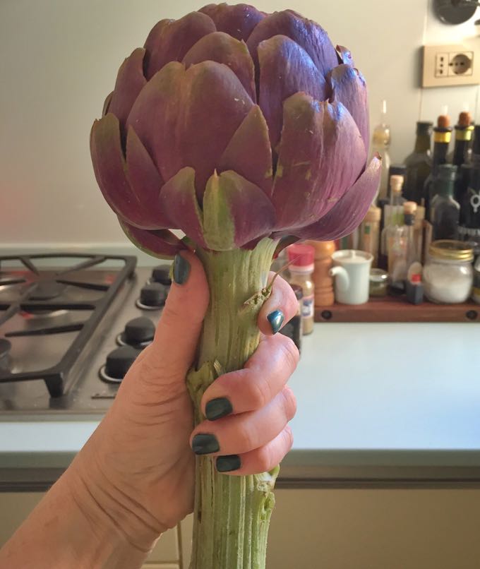 Las alcachofas ideales para hacer carciofi alla giudea son las de la variedad que sostiene Elizabeth Minchilli en la foto superior. Son moradas y son gigantes y francamente díficiles de encontrar en mi pueblo y alrededores. Si sé que existen es gracias a Minchilli, que sí que es una de esas personas que pierde la cabeza con las alcachofas y además vive en Roma.