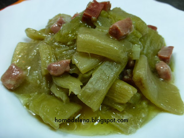 Lo primero que haremos será limpiar y cortar el cardo, seguramente tendremos que desechar las hojas de exterior ya que suelen ser muy duras. Cortamos las hojas en trozos de 5 centímetros y con la punta del cuchillo le quitamos "las venas" y un poco de los extremos, ya que son muy duros y fibrosos.