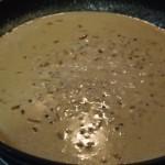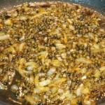 Ponemos en una sartén dos cucharadas de aceite y pochamos en el una cebolla cortada pequeñita. Cuando casi esté, añadiremos 2 cucharillas de granos de pimienta verde a la sartén y dejaremos hacer durante tres minutos. Agregamos después la leche evaporada, una pizca de sal y lo dejamos hacer todo junto tres minutos más.