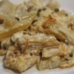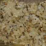 Extendemos en una bandeja para horno el cardo troceado y bien escurrido, slpimentamos y vertemos sobre el la salsa de pimienta verde. Añadimos después unas nueces picadas por encima y unos toques de queso rallado.