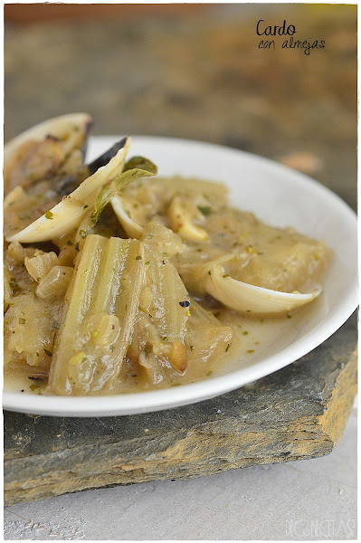 En una sartén doramos media cebolla muy finamente picada y le añadimos 4 dientes de ajo machacado en el mortero hasta que se dore de todo completamente. En ese momento agregamos 20 almejas y cocinamos a fuego alto hasta que se abran, cosa que no tardará más de un minuto. Agregamos media cucharada de harina y cocinamos para quitarle el sabor. Acto seguido agregamos media copa de vino blanco y con el fuego alto dejamos hervir para que evapore el alcohol durante 5 minutos.Por último agregamos un buen puñado de perejil y de una hoja de laurel y salamos al gusto.Como el cardo ya estaba cocido (un bote de 400gr) yo simplemente le escurrí el agua en la que venía y agregue dejando todo cocinar conjuntamente unos 2 minutos