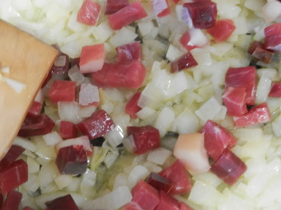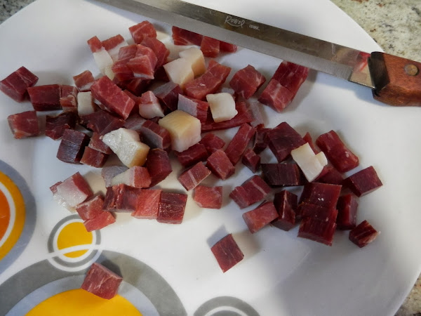 Cuando esté pochada se le añade el ajo picado y el jamón cortado a taquitos pequeños y se deja sofreír unos minutos.
