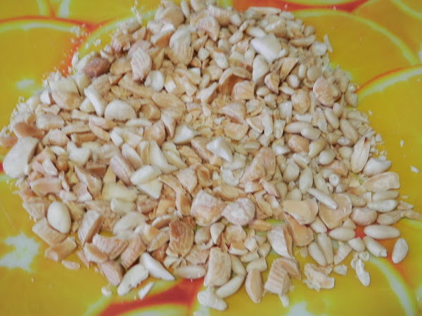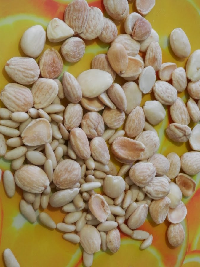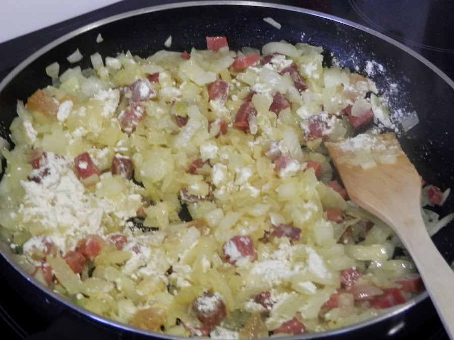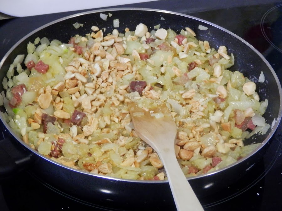 Se le añade la harina y cuando está tostada, incorporamos los piñones y las almendras picadas gruesas.