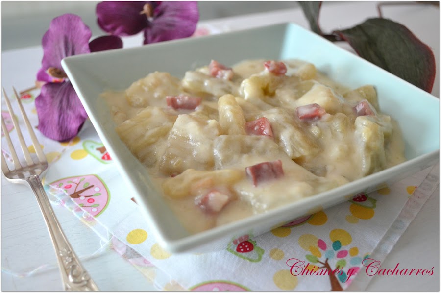 En una sartén poner un poco de aceite y sofreír los dientes de ajo cortados en láminas. Añadir el jamón cortado en dados cuando comience a sudar la grasa añadir la harina y rehogar. Verter la leche y remover hasta conseguir una crema ligera. Añadir el cardo al sofrito junto con las almendras picadas, rectificar de sal y dejar cocer 5 minutos.