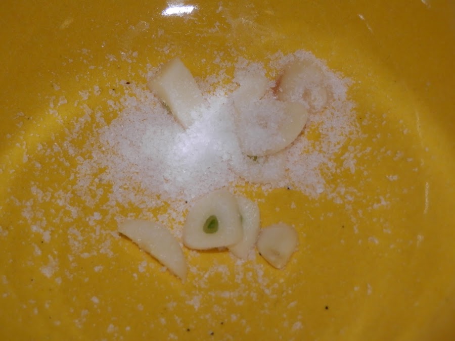 Por otra parte, en un mortero, añade el otro ajo, también partido en rodajitas.