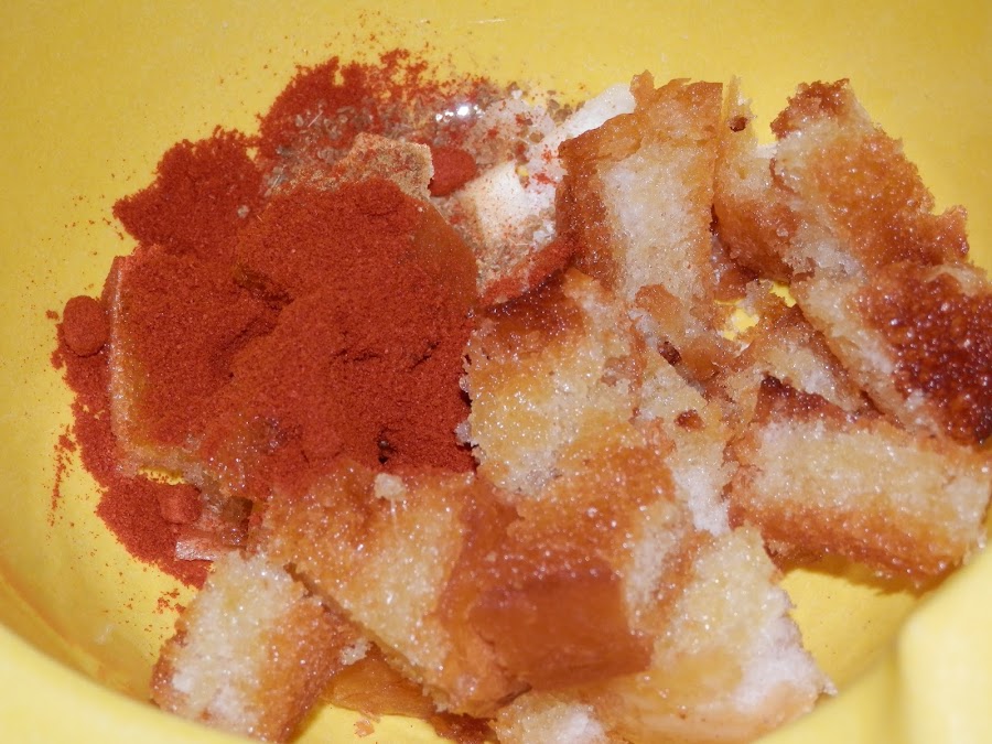 Agrega al mortero también, el pan troceado, la sal, los cominos molidos y el pimentón.