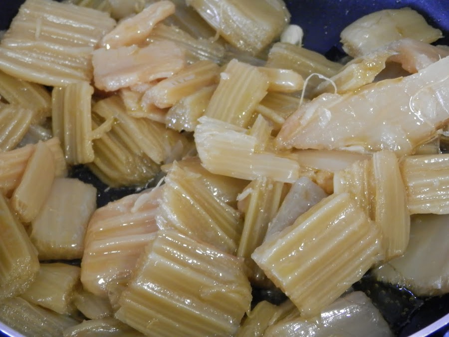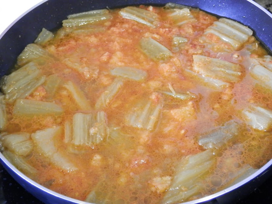 Deja dorar un poco y añade el cardo escurrido. Deja que se haga todo junto durante unos 10 - 15 minutos.