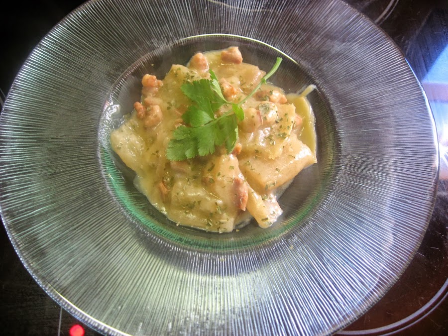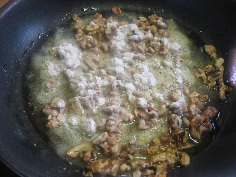 2º " En una sartén ponemos un poco de aceite de oliva, añadimos las nueces troceadas y una cucharada de harina, dejamos que se fría un poco y rápidamente añadimos un poco de caldo de la cocción de los cardos, añadimos los cardos y acabamos rectificando de sal.