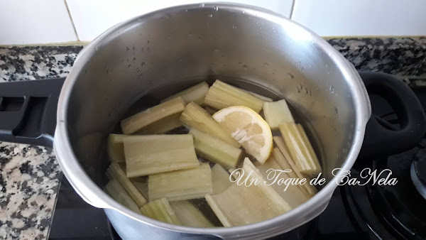 Poner a cocer el cardo con agua, sal y el limón durante 20 minutos en una olla.