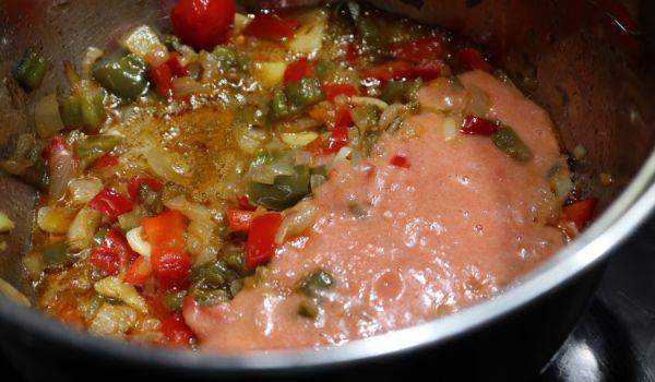 Ahora echamos el tomate triturado, el agua hasta cubrir los ingredientes y dejamos cocer unos 10 minutos.