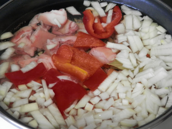 Lo vamos poniendo todo en crudo en una olla: las carillas, la carne, la cebolla, el pimiento, la zanahoria, el laurel, los ajos (sin trocear) y el pimentón.