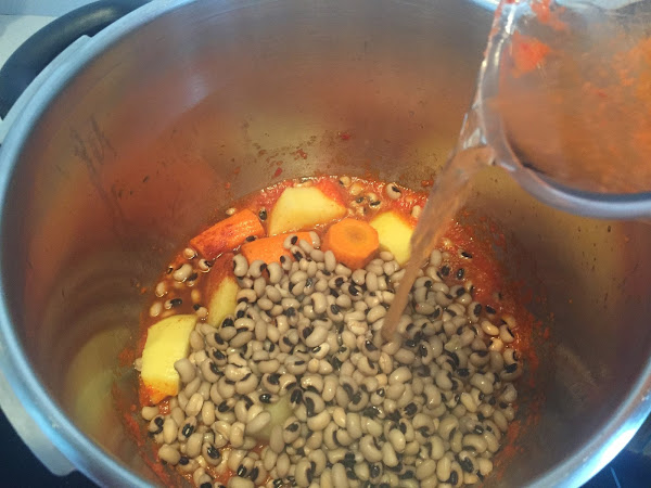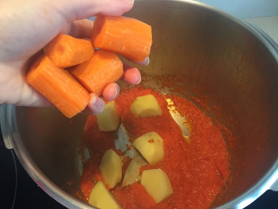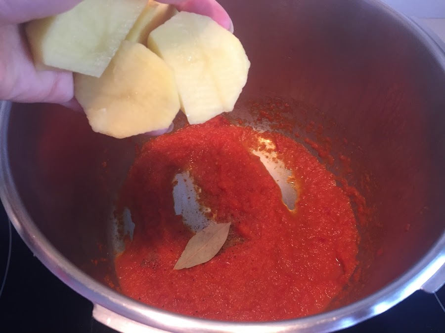 En la olla colocamos el sofrito, las carillas, la hoja de laurel, la patata cortada en trozos grandes y la zanahoria, sal y un poco de pimentón agridulce (o el que nos guste). Cubrimos con agua.
