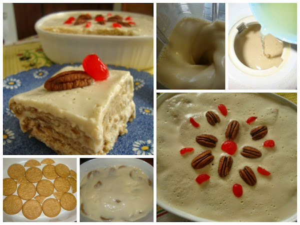 Si quieren cambiarle el sabor pueden hacerla con piñas en almíbar, utilizando el almíbar, licuándolo con las leches y le pueden agregar un poco de crema de coco, queda muy rico, y hacen el mismo procedimiento, galletas, salsa, pero aquí le colocan piñas picaditas finamente, nueces, galletas, salsa, piñas, nueces, y así sucesivamente, tienen que terminar en salsa con nueces y piña. Pueden incluso agregarle un paquete de queso crema a la mezcla y le da un sabor más cremoso...