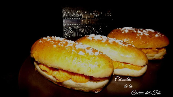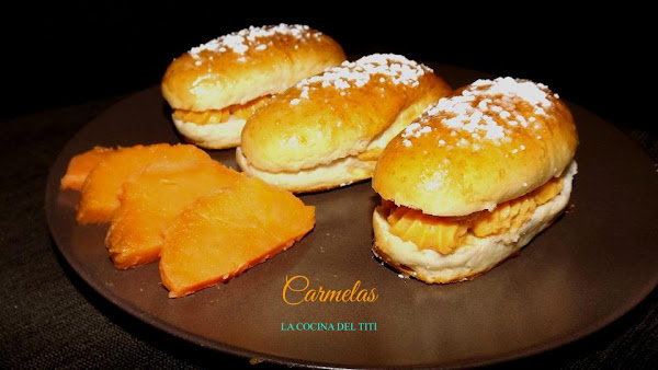 Hoy nos vamos a Jerez para realizar un dulce muy tipico de donde soy natural y en donde siempre recordare esos olores tan caracteristico desprendian esos obradores y que cuando te asomabas haber sus escaparates daba alegria ver tantas variedades de dulces pero habia algo en esas pasteleria que a mi me encantaba comer y eran esas famosas Carmelas que es como se le llama. Es un bollo alargado muy parecido a la masa del roscon de reyes el cual se le rellena con crema pastelera o bien como lo vais a ver hoy con crema de boniato.