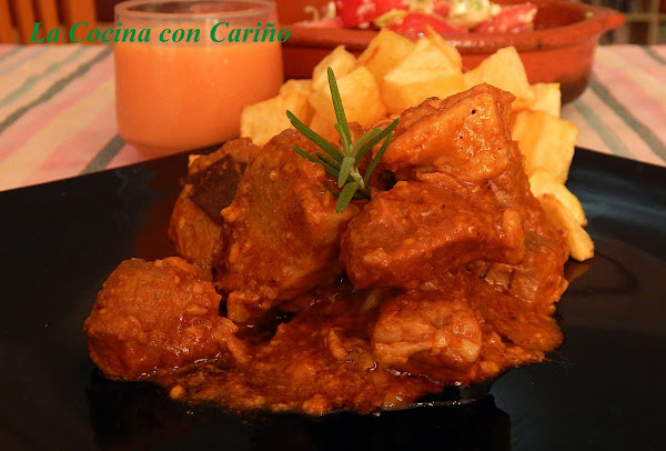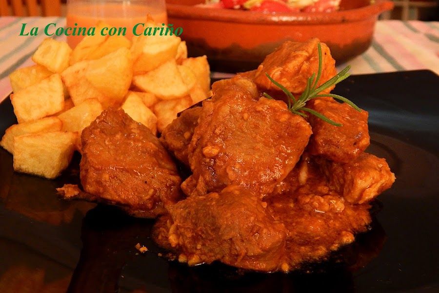 1 kg de carne de cerdo en trocitos de 2 x 2 cm. A mí me gusta usar en estos casos la aguja o cabeza de cerdo troceada, quedando esta muy jugosa.