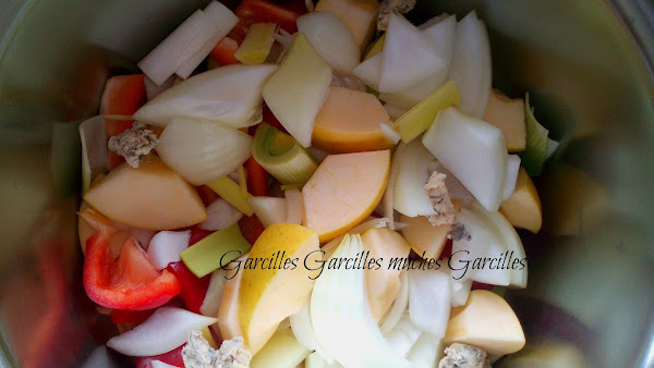Mientras poner en el cestillo de la olla la manzana y las verduras limpias y en trozos grandes