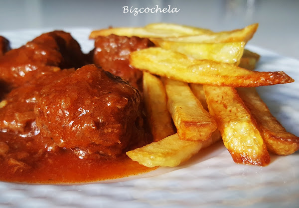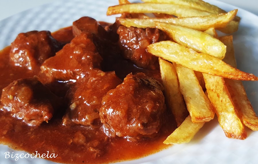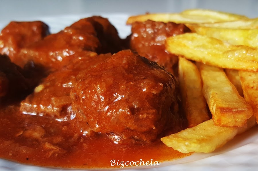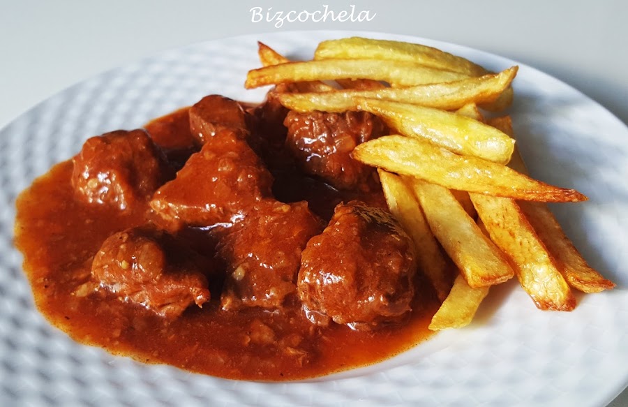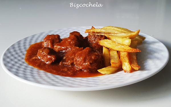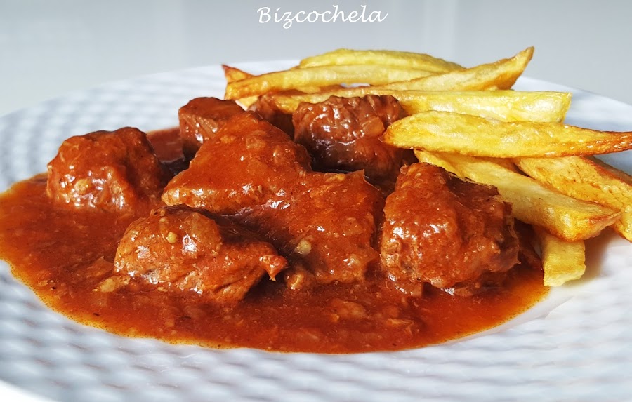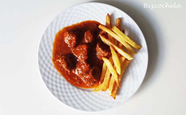 Yo en esta ocasión he elegido una receta más picante y con tomate, la verdad es que mi hijo la llamó "ternera brava"....creo que me pasé con el pique..... todo es cuestión de gustos.