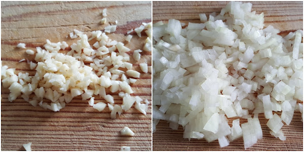 1. - Pelamos y picamos muy fino la cebolla y el ajo.