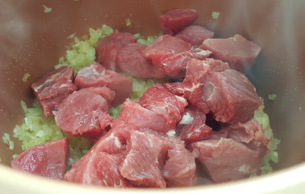 3. - Cuando esté transparente la cebolla y empezando a tomar color, añadimos la carne troceada y rehogamos. hasta que coja color toda la carne, unos 10 minutos.