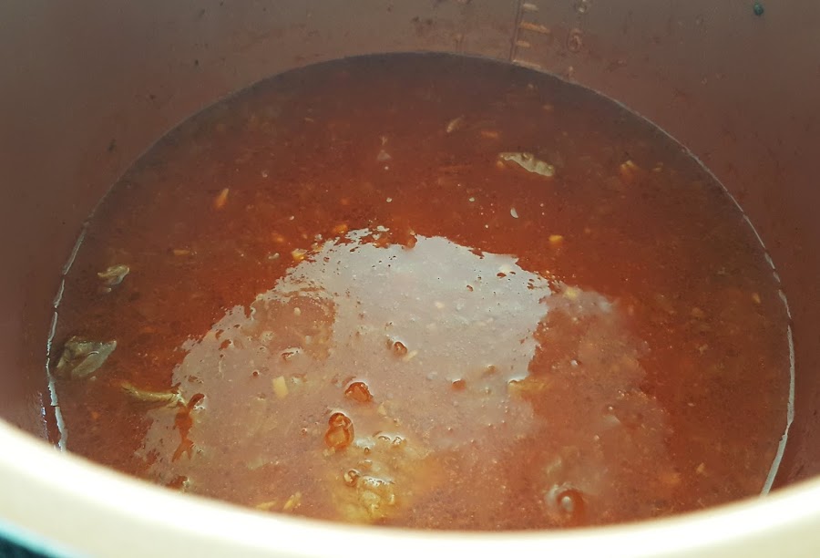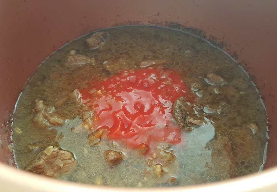 6. - Pasada la hora, le añadimos el tomate frito, removemos y dejamos cocer 30 minutos más.