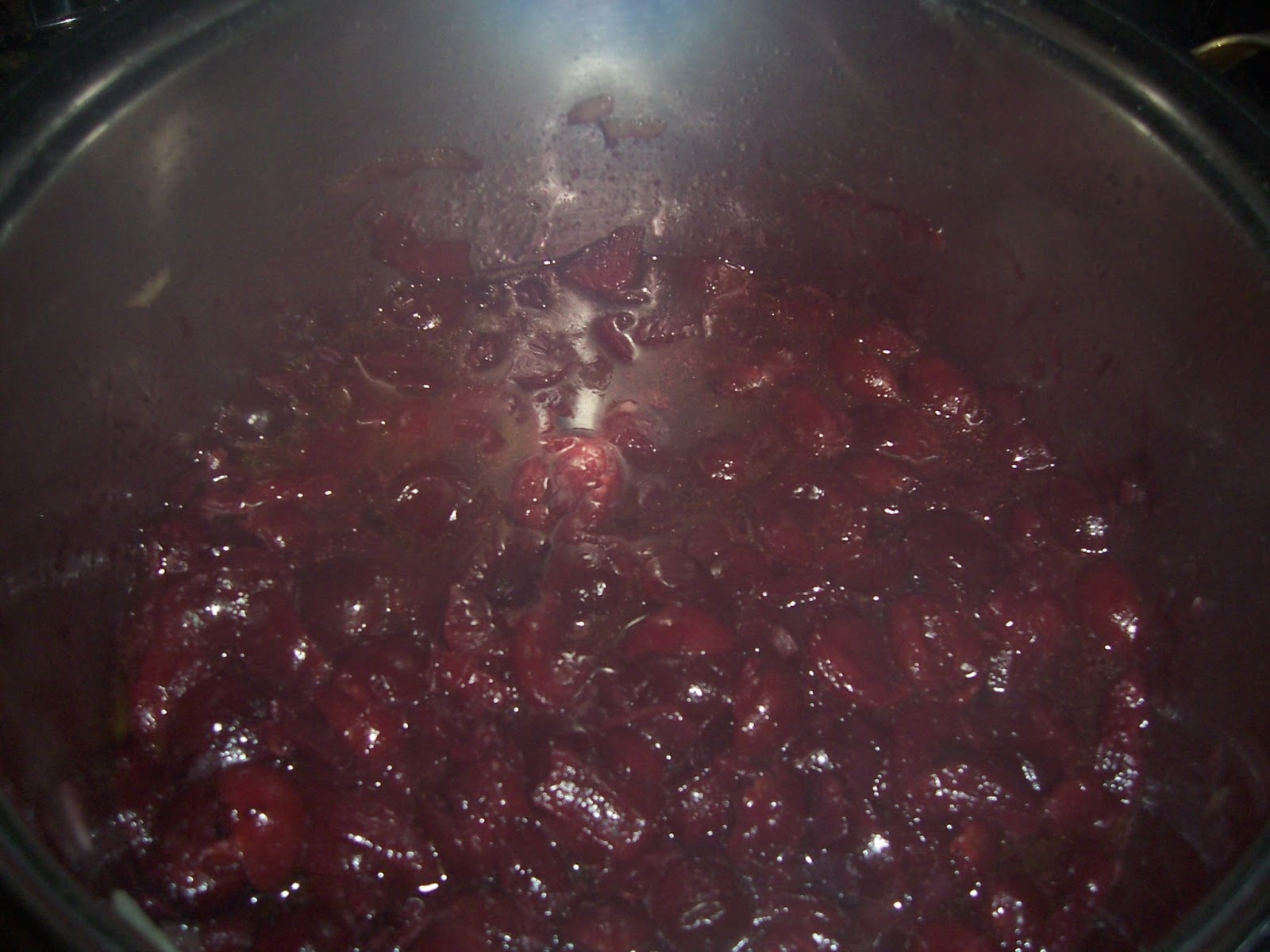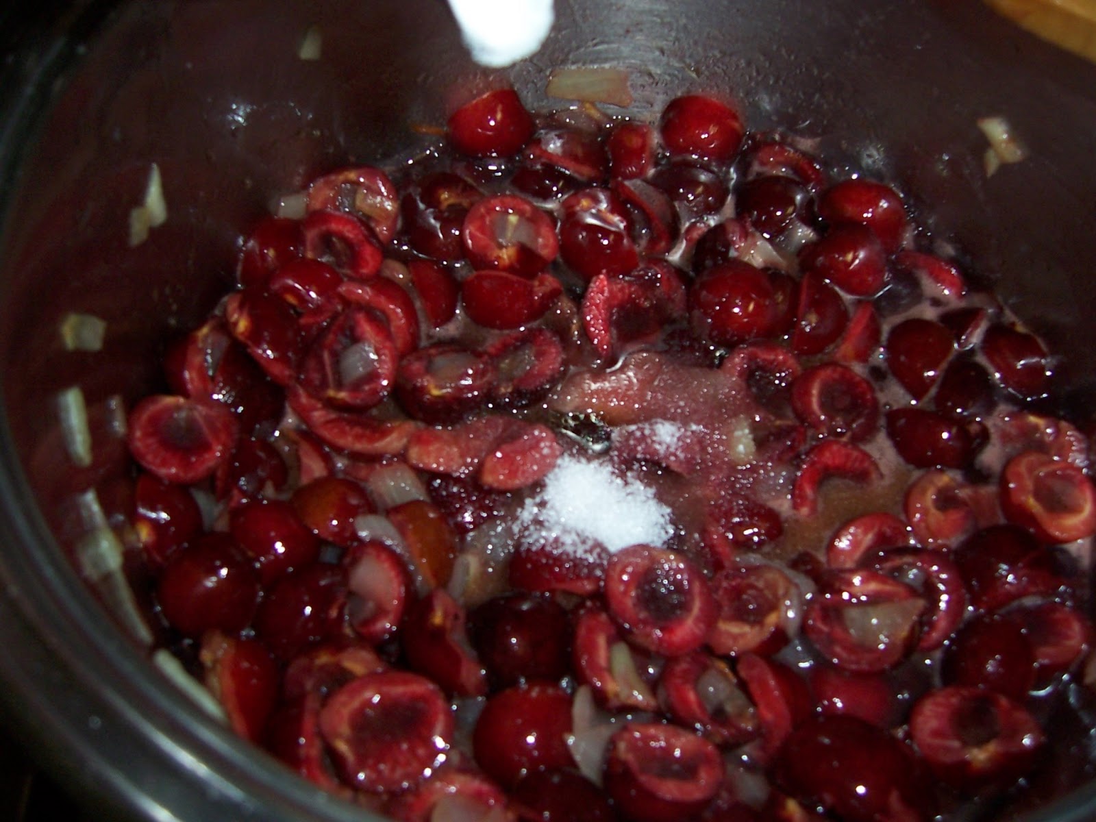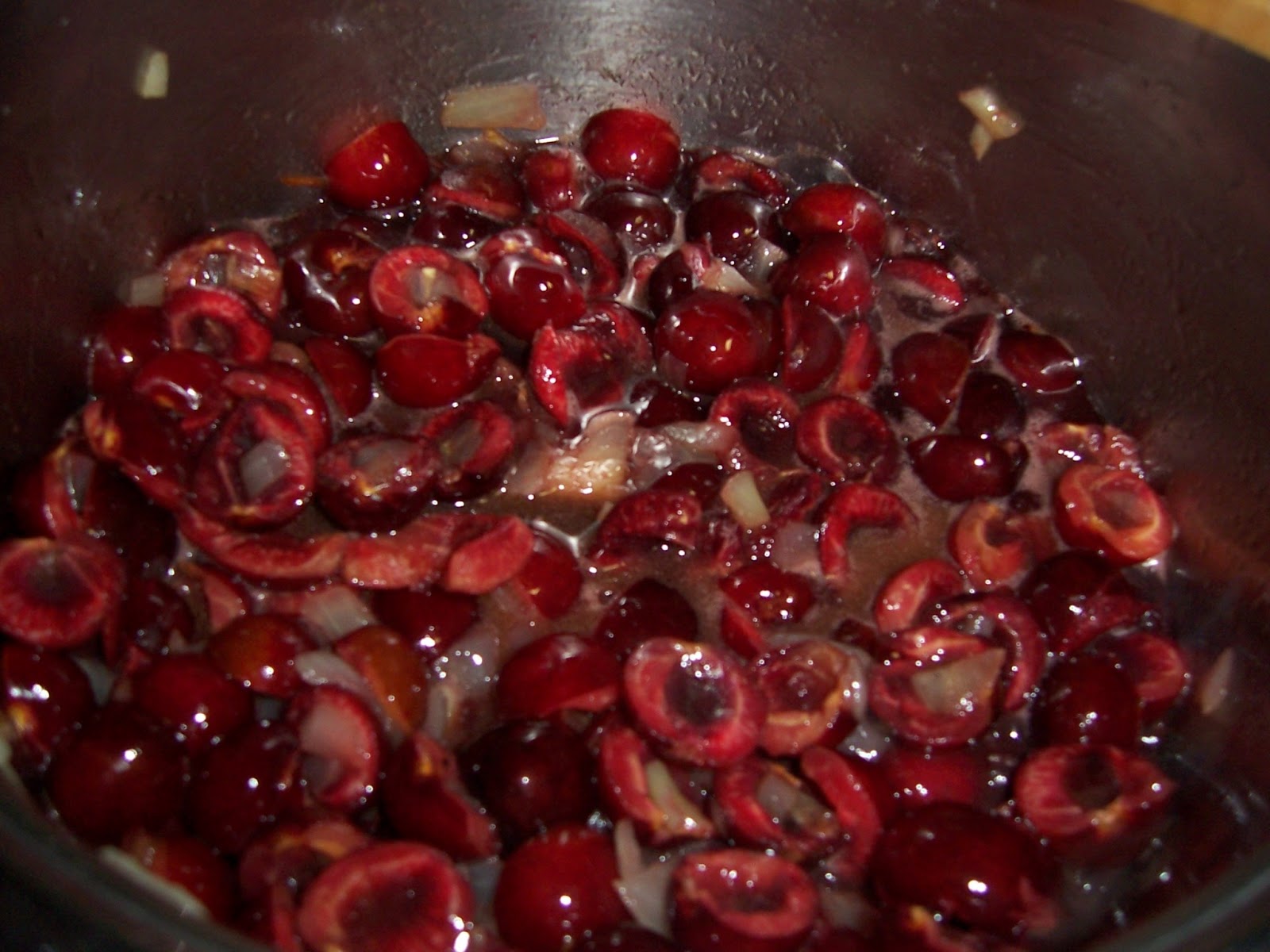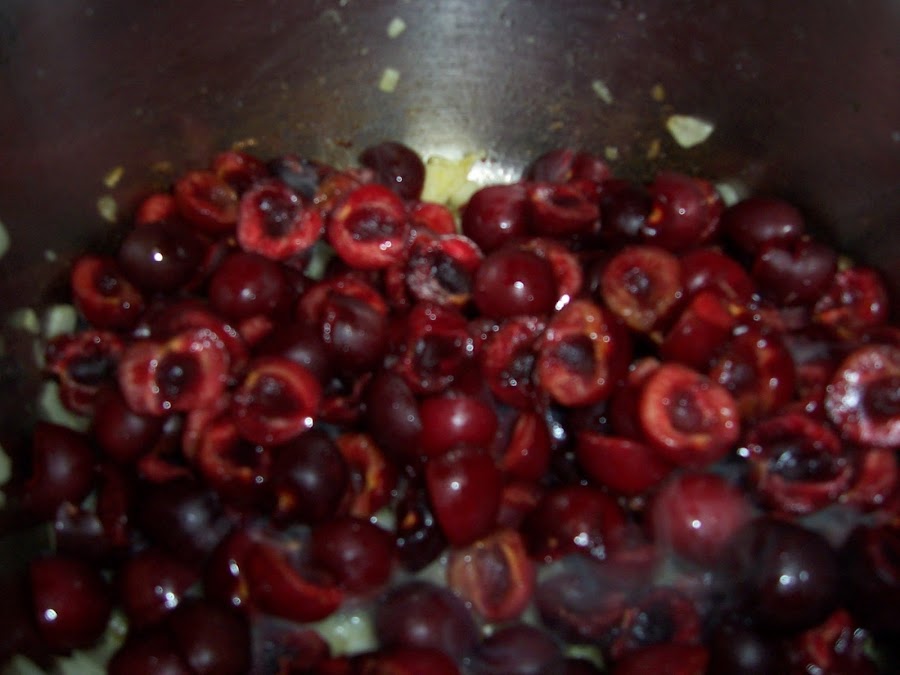 Mientras, lavamos y deshuesamos las cerezas y las añadimos a la cebolla en cuanto ésta esté lista y rehogamos todo junto un par de minutos.