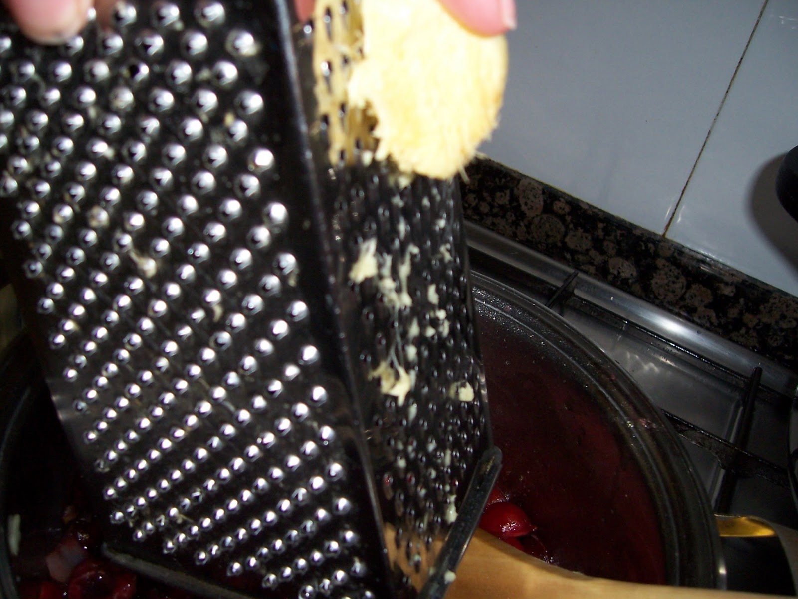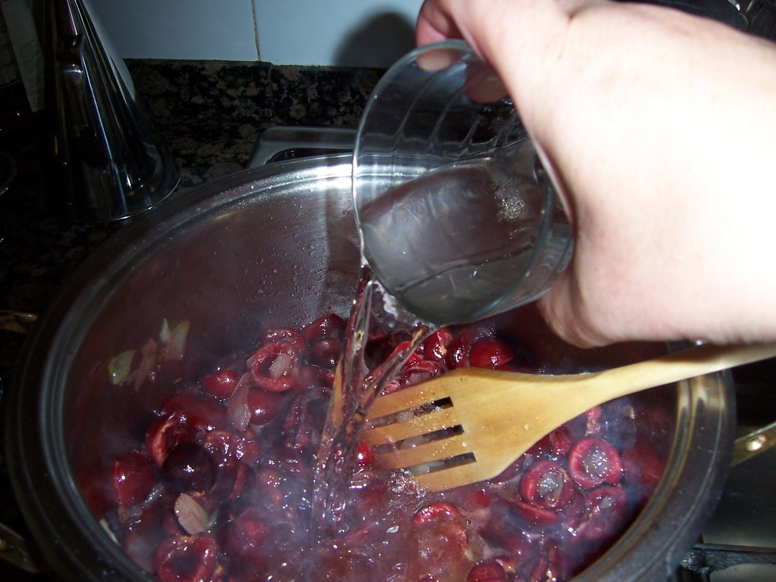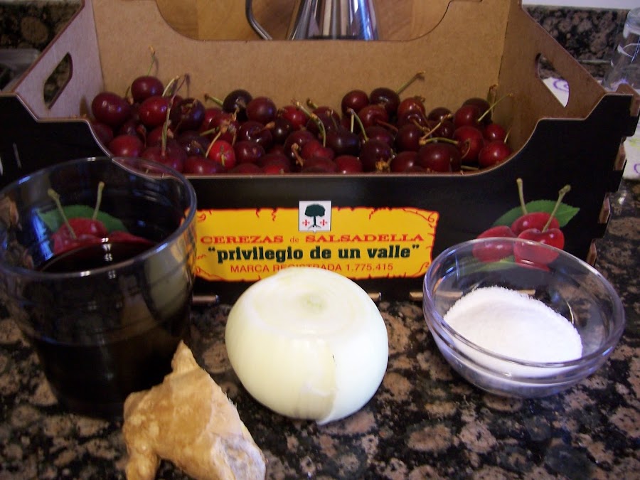 Incorporamos el vino, el agua, una cucharada de azúcar y un poco de jengibre rallado, no mucho que pica. Dejamos cocer unos 20 minutos hasta que veamos que la cereza está lista y caramelizada.