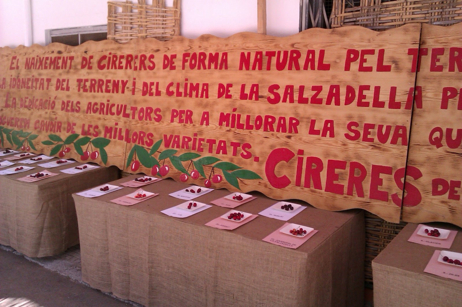 Compré una caja ¿Cómo no?, casi no llega a casa, pasó algo sospechoso en la parte trasera del coche, donde estaban sentadas mis hijas, que hacía que las cerezas fueran desapareciendo poco a poco. Como habíamos probado un montón de recetas dulces pensé en preparar una receta salada para publicar y dar las gracias a la Cooperativa Agrícola San Blas por dejarnos hacer una foto en su stand, os pongo también la foto del cartel de la feria que me gustó mucho y como no, del pueblo y de la gran variedad de cerezas que hay.