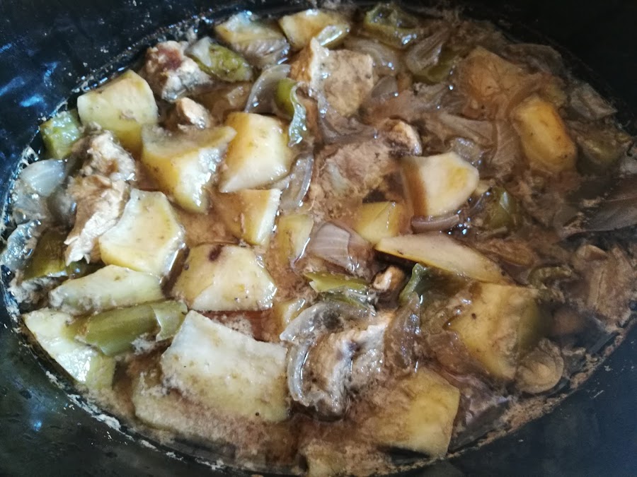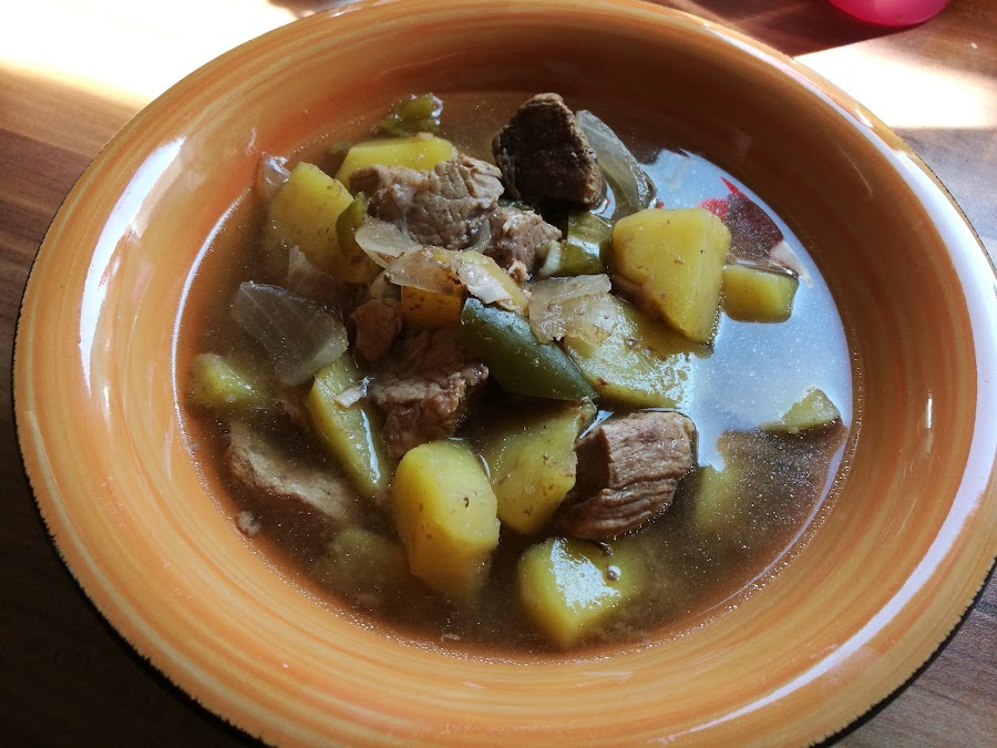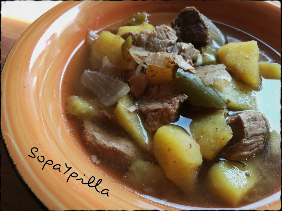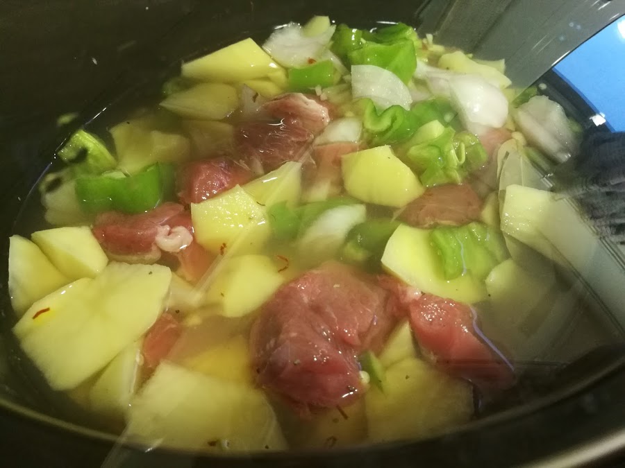 - Poner la carne salpimentada en la olla, las patatas chascadas, el pimiento troceado, y el resto de ingredientes