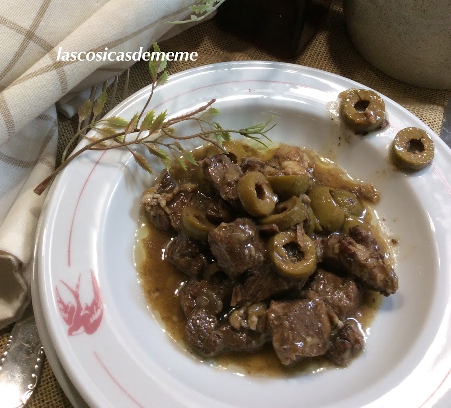 Añadimos la cebolla y sofreímos, una vez doradita ponemos la carne de nuevo, mezclamos, la harina, echamos el vino dejamos hevaporar un poco, las aceitunas, incorporamos el agua hasta que se cubra la carne, la hoja de laurel.