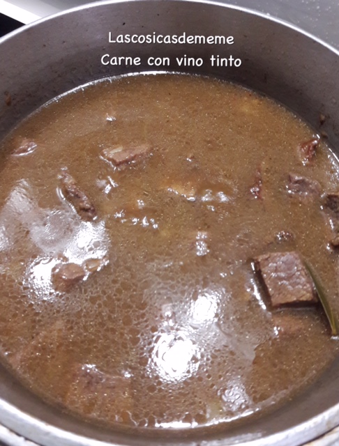 Una vez sofrita añadimos la carne, mezclamos, añadimos el vino, rascamos un poco el fondo para recoger los jugos que se quedan pegados, dejamos que hierva un poquito para que se evapore el alcohol, añadimos caldo o agua hasta cubrir, es mejor evaporar el caldo una vez hecho a que se nos pegue, dejar como se ve en la foto, cerramos y cocemos unos 45 minutos a partir de que salga el vapor de la válvula, o como vuestra olla os indique.