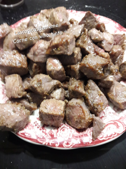 Primero, espolvoreamos la carne con un poco de harina, no mucha para que no se queme mientras la sofreímos, lo hacemos en varias veces, vamos sacando a un plato, no freír mucho lo justo para sellarla.