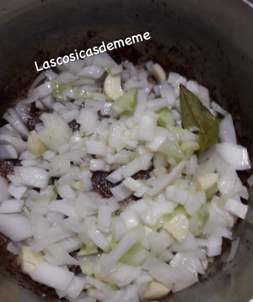 Una vez la tengamos toda la carne sofrita, ponemos la cebolla, los ajos y el laurel, lo vamos haciendo a fuego medio, no dejar que la cebolla tome mucho color, si nos pasamos , amarga (esto os sirve de consejo para cuando tengáis que sofreír cebolla)