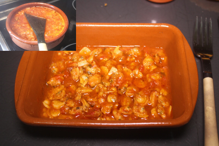 En los misteriosos, cajones del congelador de casa, me encontré una bolsa de almejas, sin concha, congeladas, como tenía pocas ganas de trabajar, la uní a un bote de tomate frito, enriqueciéndolo con un pequeño sofrito de ajo, cebolla y pimiento.