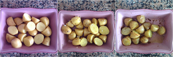 Lavamos bien las patatas y las cortamos por la mitad, sin pelarlas. Si usamos patatas más grandes, usaremos 4 unidades. Ponemos aceite en una fuente para horno y poenmos allí las patatas, añadimos sal y pimienta a gusto y agregamos el diente de ajo troceado. Removemos bien para que las patatas queden cubiertas con los ingredientes y cocinamos en horno a 180º durante 1 hora aproximadamente o hasta que al pinchar las patatas con un tenedor, estén blandas pero sin que se desarmen.