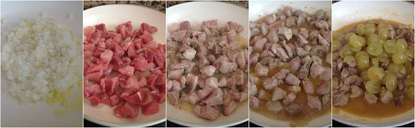 Ponemos a calentar el aceite en una sartén y doramos allí la cebolla troceada a fuego medio. A los dos minutos añadimos la carne cortada en cubitos y dejamos que se cocine durante 4 minutos, removiendo de vez en cuando para que no se pegue. Salpimentamos a gusto y añadimos el zumo de mandarinas. Tapamos y dejamos cocinar durante 10 minutos a fuego medio. Quitamos la semillas a las uvas y las incorporamos a la preparación, dejando que se cocine durante 5 minutos más.