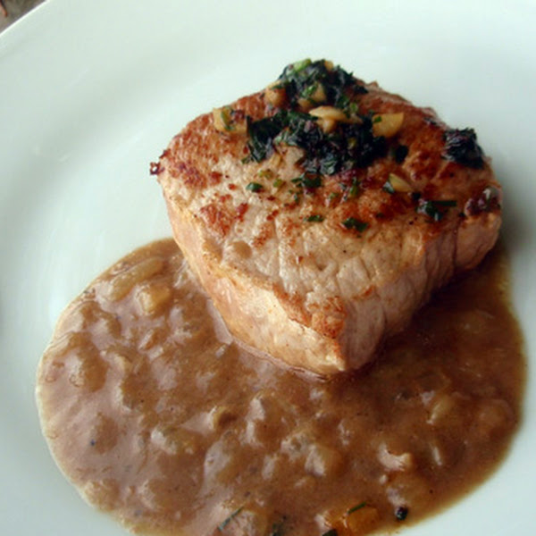Carne de cerdo apta para saltear o hacer a la plancha - una cebolla pequeña o un par de chalotas ? hongos boletus edulis (o paté de boletus o boletus deshidratados?) ? aceite ? harina ? medio vaso de caldo de carne o agua ? sal ? perejil ? ajo