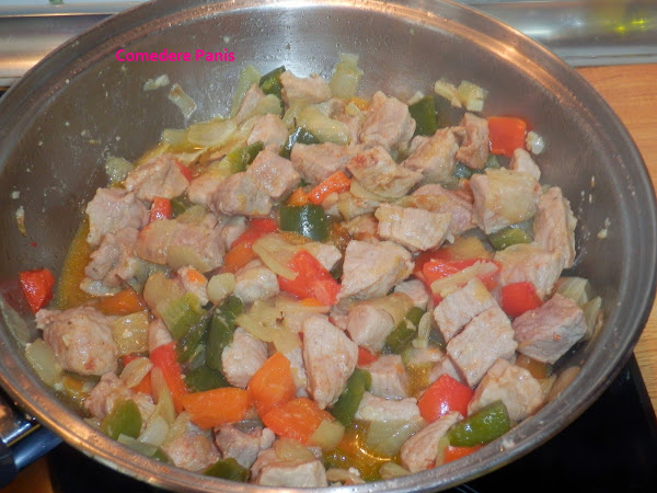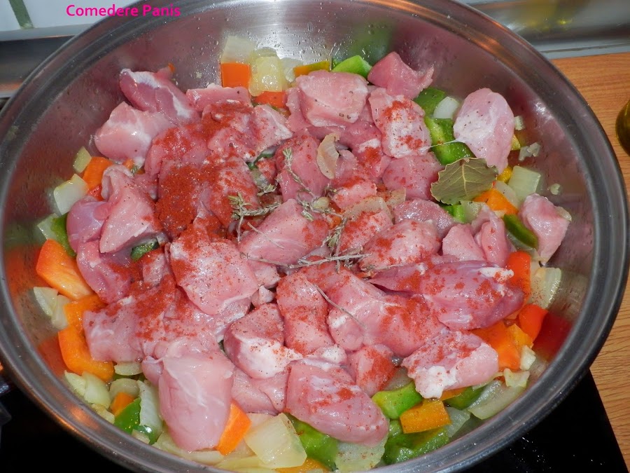 Agregar la carne salpimentada y las especies (tomillo, pimentón, laurel y pimienta picona).