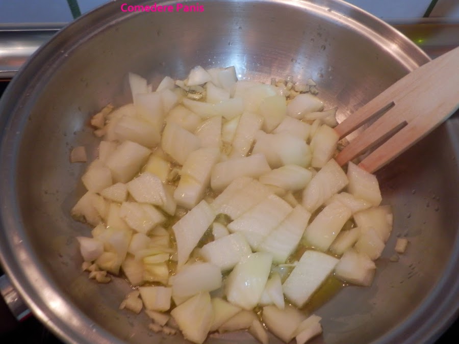 Añadir la cebolla a los ajos, rehogar la cebolla a fuego medio durante cinco minutos.