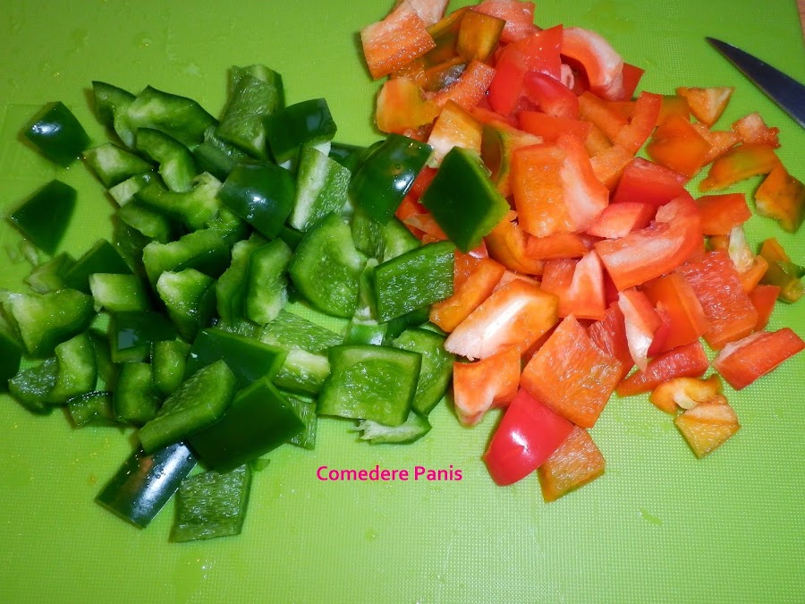 Trocear la cebolla y los pimientos en cuadros de 1 cm. aproximadamente.
