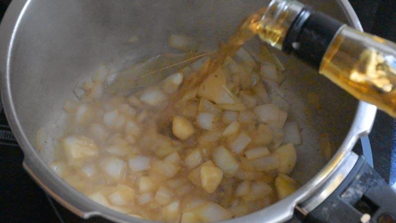 Cuando veamos que el sofrito empieza a tener color, echamos una copa de Brandy o cualquier coñac que tengas por casa.