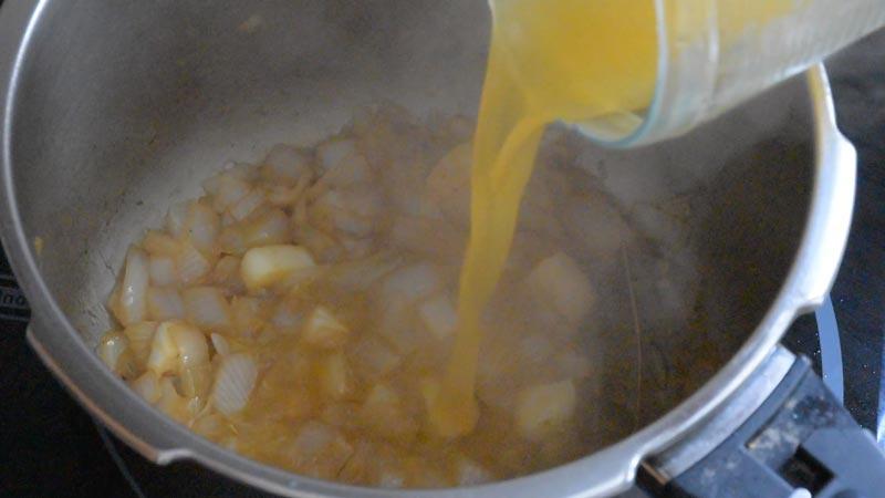 Y ahora volvemos a meter la carne dentro de la olla rápida. Aprovecha y echa los jugos que ha podido soltar la carne en el plato donde lo habíamos sacado antes.