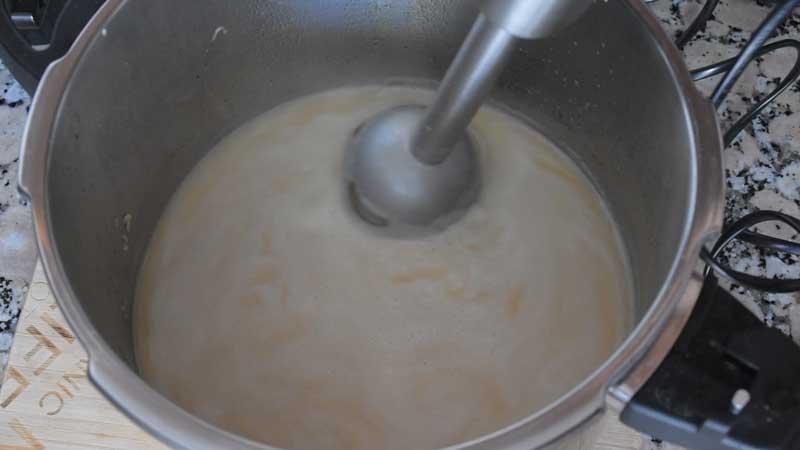 Si lo vas a hacer en olla normal, los tiempos de cocción se doblan, incluso a veces hasta lo tenemos que dejar el triple de tiempo. Así que lo normal sería tener la carne en la olla tradicional como 1 hora y media, dándole la vuelta a la mitad de cocción.Sacamos la carne, le quitamos las hojas de laurel a la salsa y con la ayuda de la batidora trituramos todos los ingredientes para tener una salsa líquida.