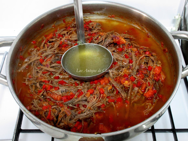 Deshebramos la carne y reservamos el caldo. Cuando la carne esté blanda, la sacamos de la olla y la dejamos templar en un plato para poderla desmenuzar sin quemarnos. Colamos o filtramos el caldo de la cocción de la carne y reservamos 400 ml. El resto del caldo, una vez frío, se puede refrigerar o congelar para ser usado en otra preparación. Les recomiendo que no lo tiren, tiene muy buen sabor. Deshilachamos la carne en hebras delgadas o medianas, según lo prefieran. En la receta sólo vamos a usar las hebras limpias, los pellejos que puedan haber se desechan.