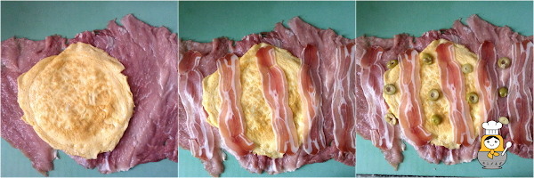 Estiramos la carne en una superficie lisa, la salpimentamos y colocamos la tortilla encima. Después ponemos encima las lonchas de bacon y por último, unas cuantas aceitunas, que habremos cortado previamente.