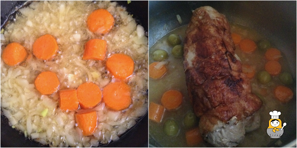 Pelamos y picamos la zanahoria en rodajas y la cebolla y el ajo en trozos no muy pequeños. Sofreímos las verduras en el aceite de freír la carne y cuando empiecen a dorarse, añadimos las aceitunas que nos hayan sobrado y echamos un buen chorro de vino blanco. esperamos a que se evapore el alcohol y vertemos el caldo de verdura. Cuando levante hervor, ponemos en la salsa el rollo y dejamos cocer a fuego lento durante una hora más o menos (la vamos pinchando con un tenedor hasta que notemos que está blandita).