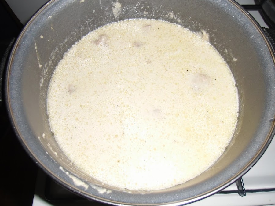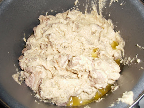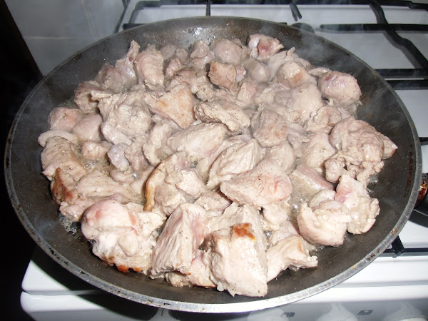 Ponemos la carne en una olla al fuego y le añadimos lo que acabamos de batir
