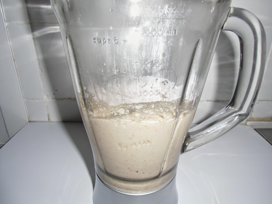 Ahora mezclamos la cebolla y los ajos pochados con las almendras , el pan, un vaso de agua y lo pasamos por la batidora
