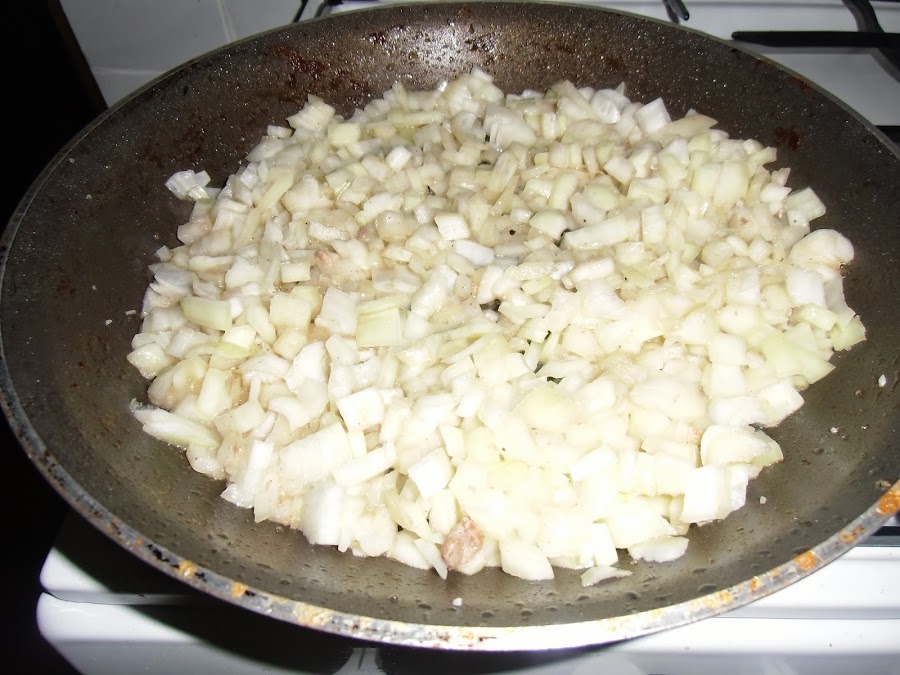 En la misma sartén donde hemos dorado la carne pochamos las cebollas y los dientes de ajo bien picaditos con un poco de sal.