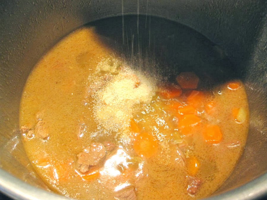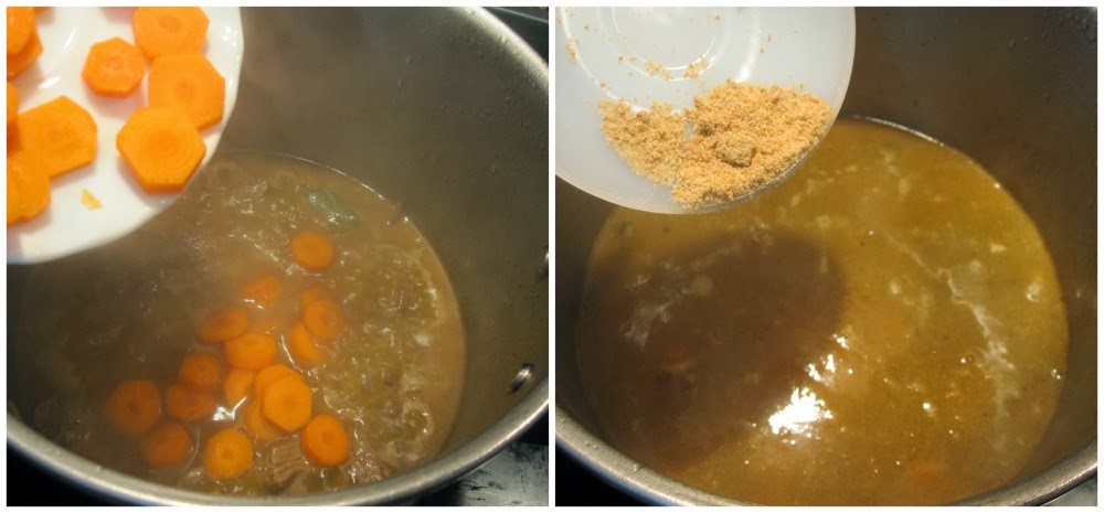 13. Pasado el tiempo necesario, abrimos la olla, se prueba la carne y, aunque no debería pasar, si te parece que ha quedado dura, puedes darle unos minutos más con la olla cerrada o abierta. Si está lista, añade sal y un poco de pan rallado para que espese el caldo.
